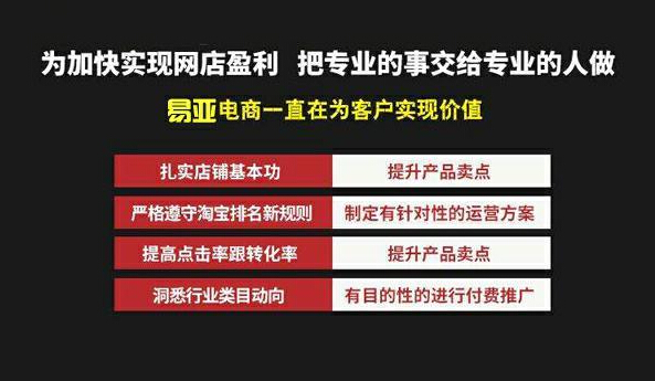 中小卖家想要找淘宝代运营公司,可以选择易亚电商,成立九年时间,一直在淘宝代运营行业深耕和研究,用技术和服务征服每一位客户的心。200人专业团队,挂牌企业,品质有保障,能够更好的帮助商家运营店铺。